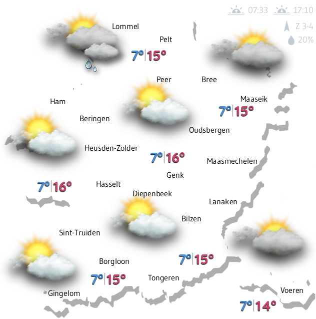 Voor de zeer korte termijn zijn de weerkaarten niet meer zo relevant, en kunnen we veel beter afgaan op wat de satellietbeelden (wolken) en radarbeelden (regen) ons tonen. Op deze pagina vindt u een overzicht van de voornaamste wolkenfoto's en neerslagmetingen, niet alleen boven Limburg maar ook om ons heen.