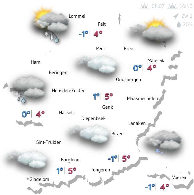 In de loop van de dag kan er mogelijk langdurig neerslag vallen. Vooral in de hoger gelegen delen van Limburg kan dit smeltende sneeuw worden. In dat geval blijft de temperatuur steken op 2 a 3 graden. Komt de zon er eens even door, dan kan het tijdelijk 4 a 5°C worden.