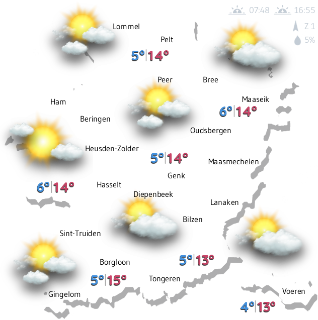 Maandag blijft het tot de avond droog. Eerst is het vrij zonnig maar geleidelijk neemt de bewolking toe. Namiddag kan er al eens een lokale bui vallen. In de loop van de avond zal er een zwakke regenzone van west naar oost over Limburg trekken.