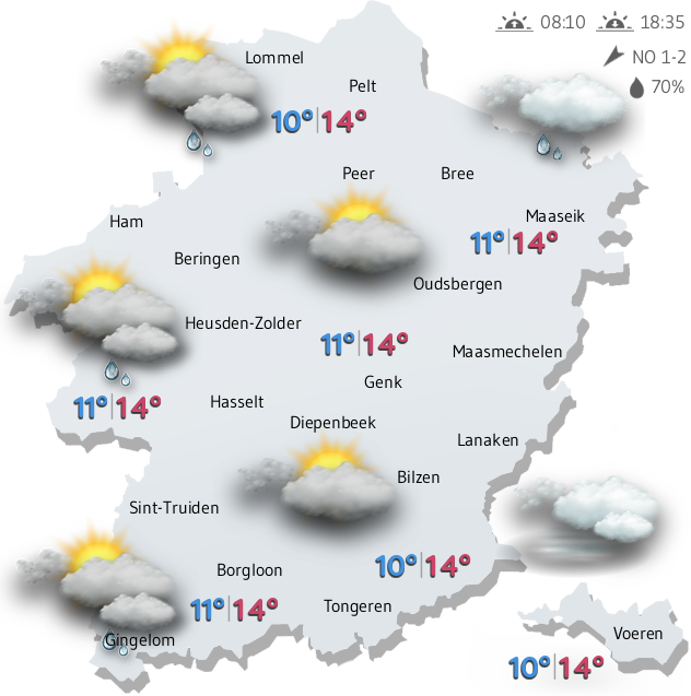 Vandaag trekken er veel lage wolken over Limburg. Die wolken kunnen van tijd tot tijd dik genoeg worden om er wat regendruppeltjes uit te kunnen persen. Veel zal het echter niet voorstellen. Sporadisch kan er ook eens een gaatje verschijnen, om voor wat zonnestralen te kunnen zorgen.