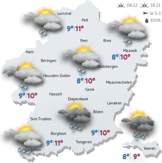 Na een wisselvallige nacht, kan het in de vroege ochtend regionaal in Limburg eerst nog wat miezeren. In de loop van de ochtend zal het een tijdje overal droog worden, maar nog vóór het middaguur komt er vanuit het noordwesten een volgende regenzone opzetten. Deze zal het tot halverwege de namiddag kletsnat houden, waarna het eerder wisselvallig wordt met nog een reeks buien. Tussendoor kan er even ruimte komen voor de zon.