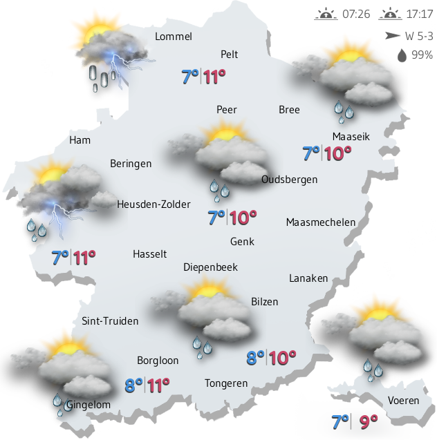 Voor de zeer korte termijn zijn de weerkaarten niet meer zo relevant, en kunnen we veel beter afgaan op wat de satellietbeelden (wolken) en radarbeelden (regen) ons tonen. Op deze pagina vindt u een overzicht van de voornaamste wolkenfoto's en neerslagmetingen, niet alleen boven Limburg maar ook om ons heen.