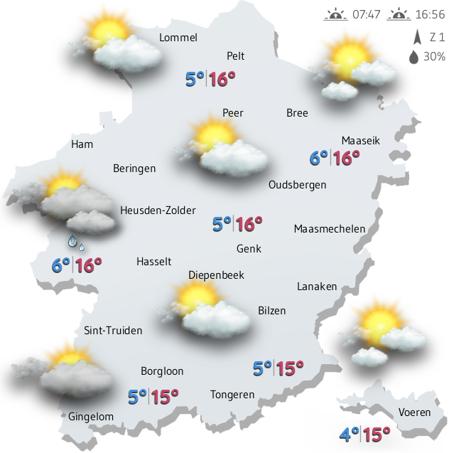 Vandaag blijft het in Limburg tot na zonsondergang droog. Voormiddag is er nog veel ruimte voor de zon. In de loop van de namiddag komt er stilaan meer bewolking opzetten. Vanavond kunnen er enkele lokale buien van west naar oost over Limburg trekken.
