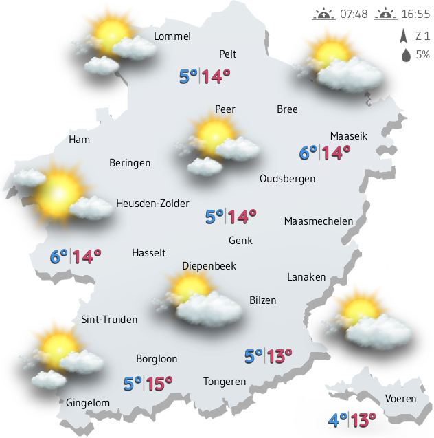 Na een bewolkte start zien we vanuit het westen blauwe lucht verschijnen. De wolken trekken weg naar Duitsland en maken zodoende plaats voor een grotendeels zonnige namiddag. Het blijft dus ook droog.