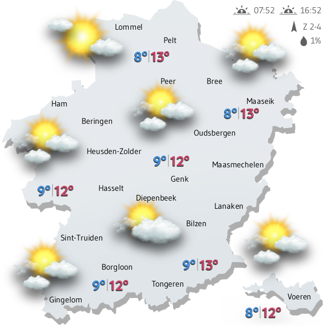 Vandaag kunnen we boven Limburg vaak brede opklaringen verwachten. Vanochtend zijn er nog veel sluierwolken aanwezig, maar deze zullen geleidelijk dunner en minder talrijk worden.
