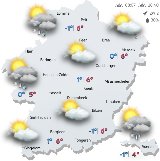 Vanavond vallen er in Limburg nog talrijke buien. Daarbij is er naast voornamelijk regen, ook korrelhagel of smeltende sneeuw mogelijk. Dit laatste vooral bij de laatste neerslag in het hoger gelegen zuiden van onze provincie.